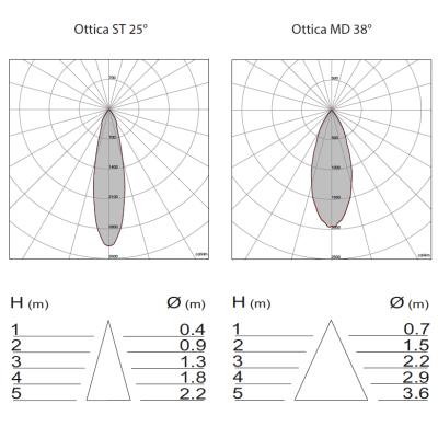 Óptica de aluminio metalizado de haz amplio (cód.LA), haz medio (cód.MD), haz estrecho (cód.ST), haz spot (cód.SP).