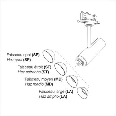 Óptica de policarbonato metalizado de haz amplio (cód. LA) haz medio (cód. MD) haz estrecho (cód. ST) haz spot (cód. SP).