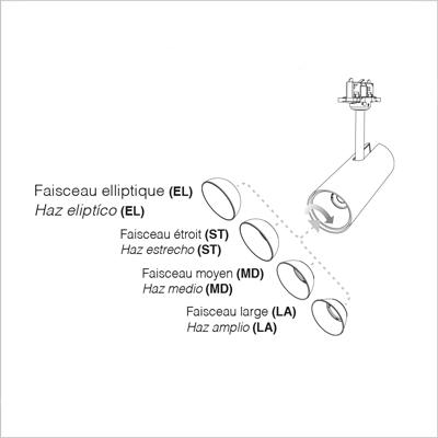 Óptica de policarbonato metalizado de haz amplio (cód. LA) haz medio (cód. MD) haz estrecho (cód. ST) haz eliptíco (cód. EL).