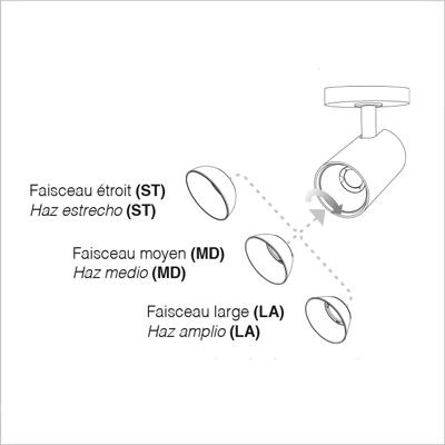 Projecteur LED orientable avec optiques èchangeables. Fixation en saille.