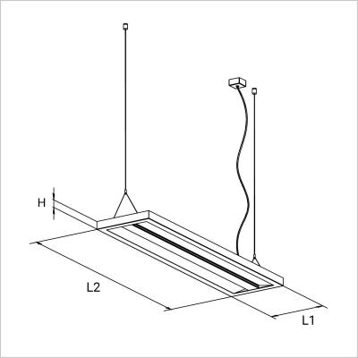 Installazione a sospensione con cavi in acciaio regolabili (lunghezza standard 2 m). Accessori per installazione (bifido) e rosone elettrificato inclusi.