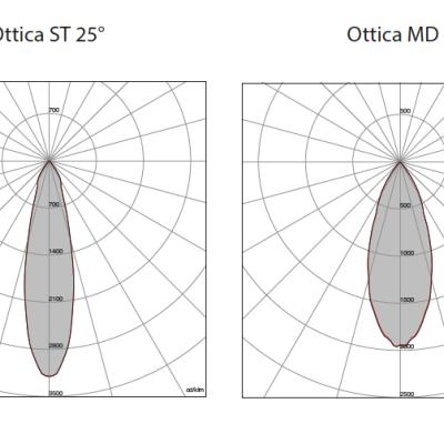 Ottica in policarbonato metallizzato fascio largo (cod. LA), fascio medio (cod. MD) fascio stretto (cod. ST) fascio spot (cod. SP).