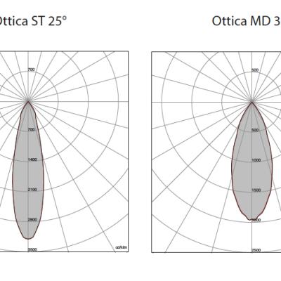 Ottica in alluminio metallizzato fascio largo (cod. LA) fascio medio (cod. MD) fascio stretto (cod. ST) fascio spot (cod. SP).