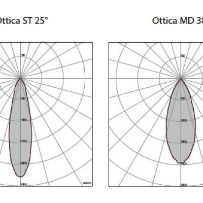 Ottica in allumiio metallizzato fascio largo (cod. LA), fascio medio (cod. MD) fascio stretto (cod. ST) fascio spot (cod. SP).