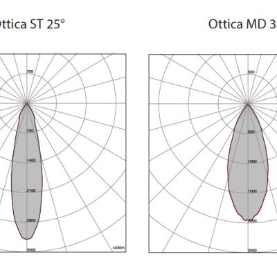Ottica in allumiio metallizzato fascio largo (cod. LA), fascio medio (cod. MD) fascio stretto (cod. ST) fascio spot (cod. SP).