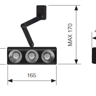 Proiettore LED orientabile a binario con staffa snodabile per gole luminose.